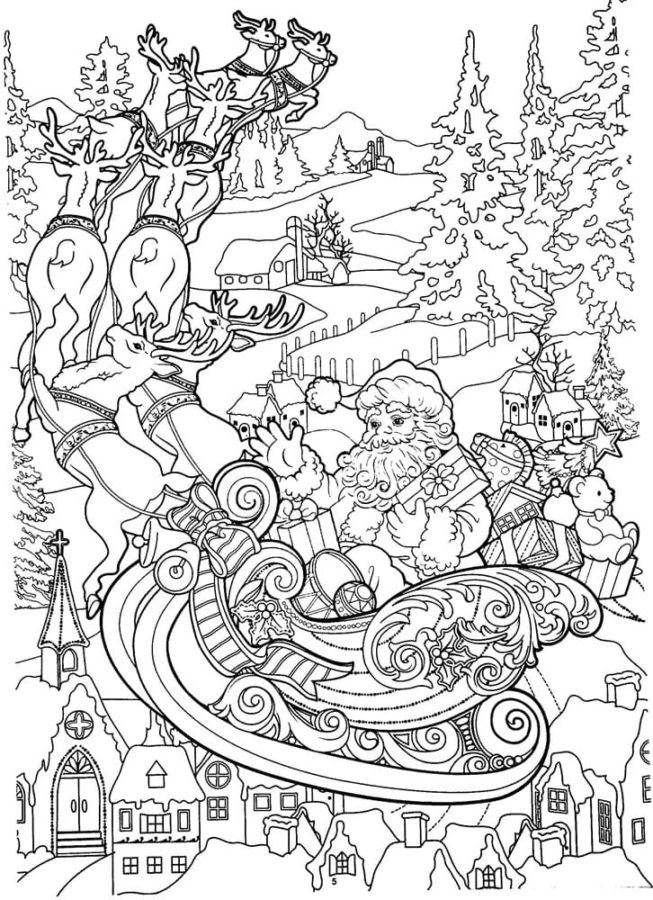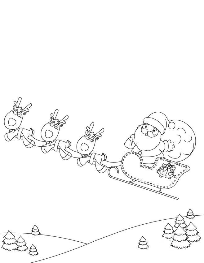 Julemanden flyver højt oppe i skyerne i sin slæde